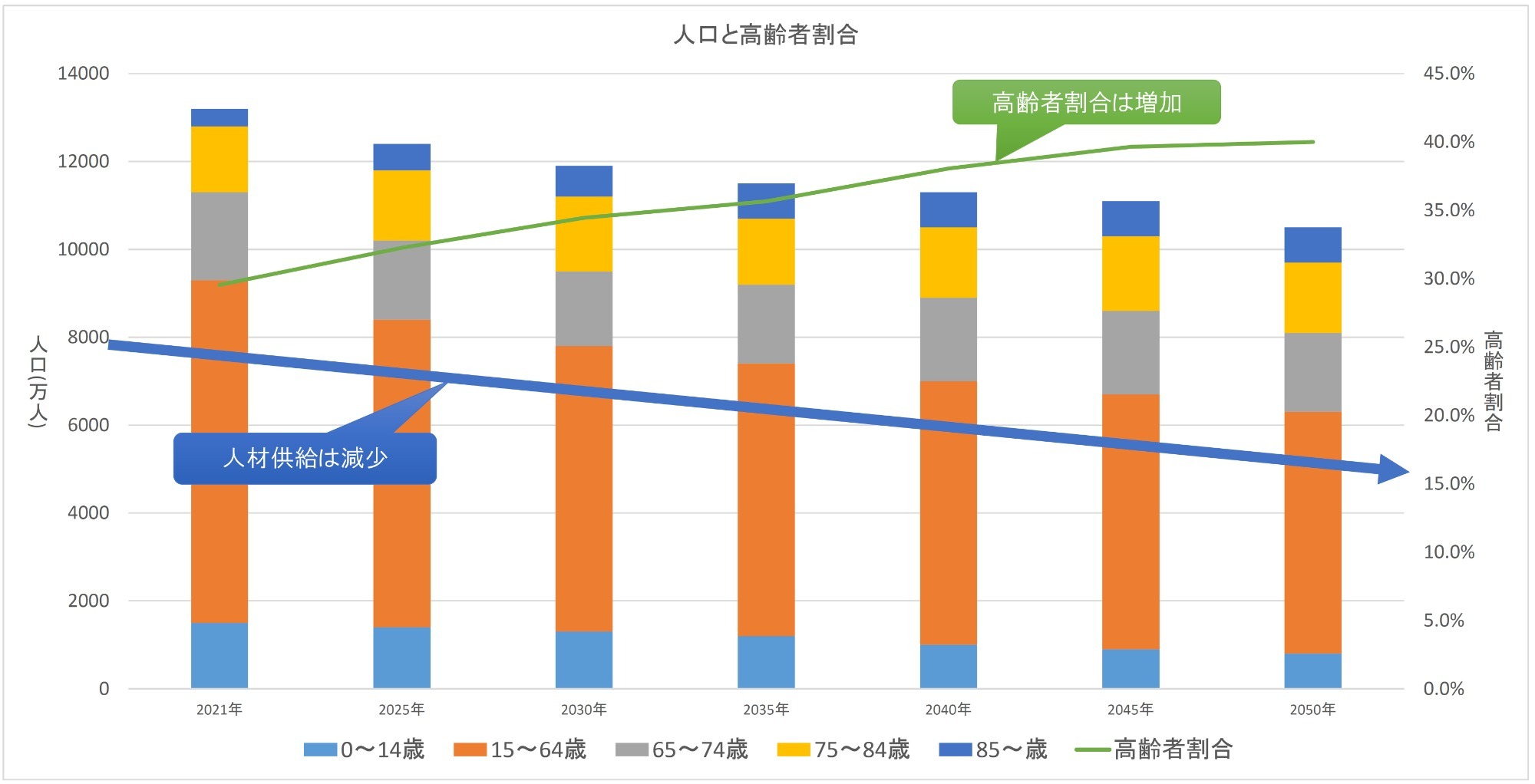 今後の日本全体の課題として、人口減少や高齢者割合の増加による労働力人口の減少、生産性の低下などがあります。